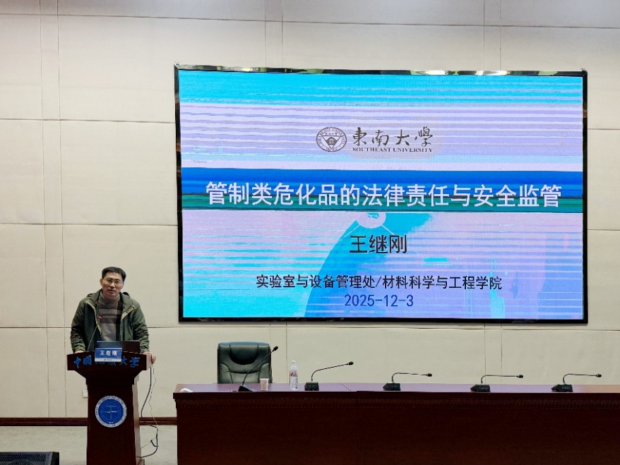 为强化实验室安全管理,提升管制类危化品管控能力,作为学校 2025 年实验室安全教育宣传月活动的重要组成部分,2025年12月3日,由学校实验室与设备管理处主办、搜书吧 承办的管制类危化品安全专项培训顺利举行。东南大学实验室与设备管理处副处长王继刚、武汉纺织大学资产与实验室管理处副处长刘福金应邀指导,学校实验室与设备管理处副处长翁华强、搜书吧 党委书记邓云涛出席,各单位实验室安全管理人员及涉危化品师生共 150余 人参训,培训会由搜书吧 实验中心主任殷杰主持。