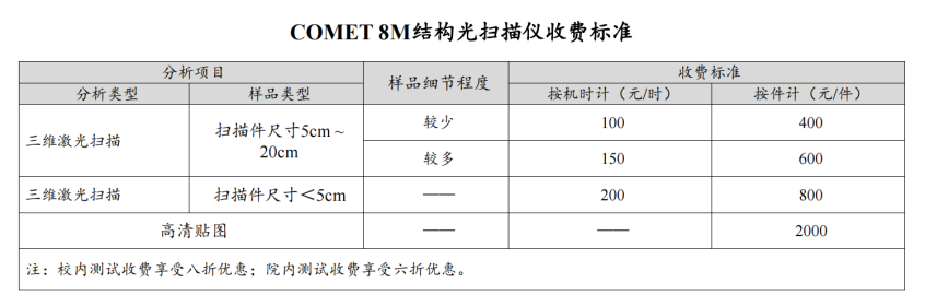 器型号:ZEISS COMET L3D_2 8M;摄像机分辨率(像素):3296 x 2472量程范围:75镜头哦:80 x 60 x 40mm;300镜头:325 x 240 x 200mm;计算机:可使用台式电脑或笔记本电脑;测头支撑:具备手动旋转/倾斜轴的三脚架;自动化零件支撑:旋转工作台(COMET转台);可用软件:ZEISS colin3D。