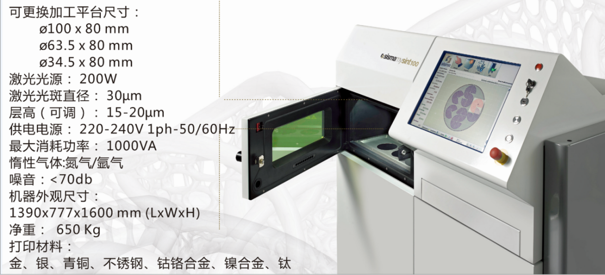 仪器型号为Mysint 100 RM - PM,适合打印各种贵金属以及钛金属等。SLM一体成型,尺寸精度高,致密度高,机械性能指标优于铸件,甚至可达到锻件水平,显微维氏硬度可高于锻件。