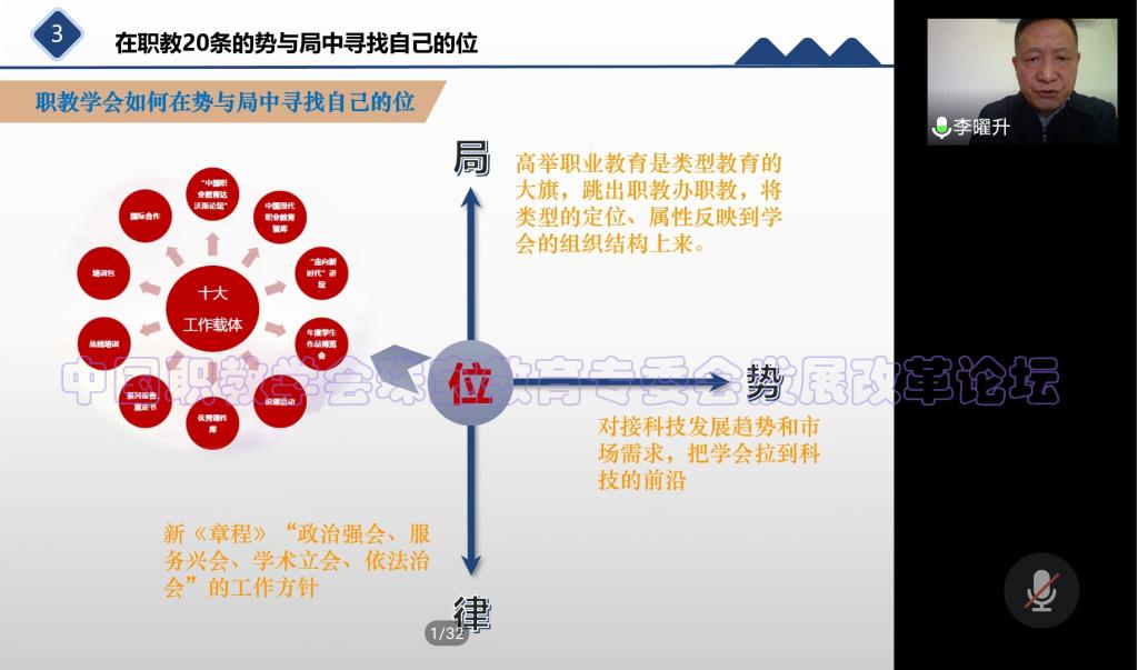 特邀嘉宾李曜升教授在题为“用战略思维理解把握“职教20条”的局、势、律”的主旨报告中指出,要用战略思维理解和把握党的十九大精神,同时也要用战略思维把握“职教20条”的局、势、律。局——就是高举职业教育是类型教育的大旗,跳出职教办职教,将类型定位、属性反映到学会、专委会的组织结构上来;势——就是对接科技发展趋势和市场需求,把学会、专委会拉到科技前沿;律——就是按照新《章程》办会,坚持“政治强会、服务兴会、学术立会、依法治会”的工作方针。各级学校要在“职教20条”的坐标中找准自己的位。