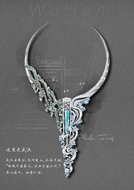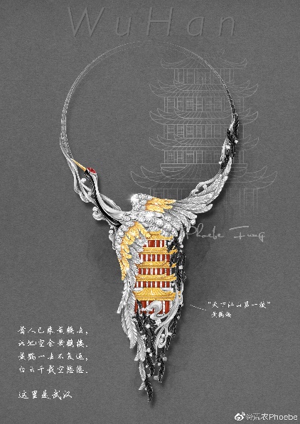 创作日记: 提到武汉一定会想到黄鹤楼,虽然武汉本地人不一定会去,但是在武汉的我,这八年陪着外地来的亲友去过无数次,留下了很多回忆。我在这件首饰中加入了象征着福寿绵长的黄鹤意象,造型是鹤首向上,羽翼用一种保护的形态包裹住黄鹤楼,寄托了我的美好期望。