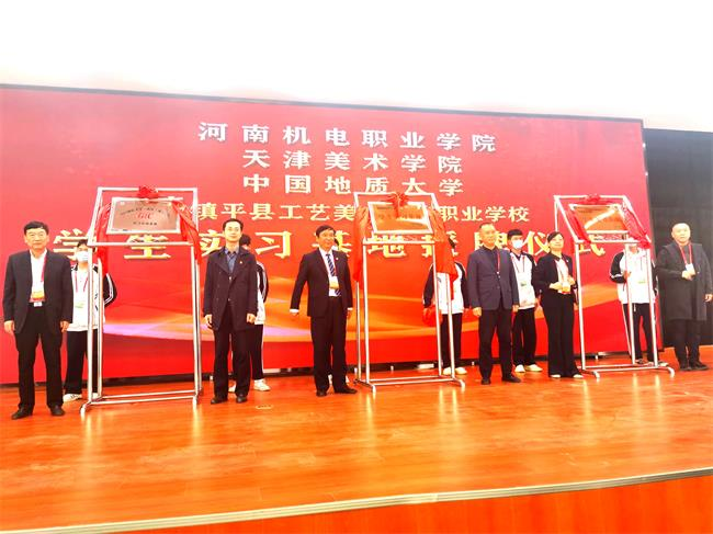 签约仪式后,在南阳珠宝玉雕职业技术学院(筹)(镇平县工艺美术中等职业学校)举行了高等院校学生实习实训基地授牌仪式,镇平县领导与相关院校领导共同为基地揭牌。镇平县石佛寺镇玉器市场和镇平工艺美校一直是搜书吧 学生教学实习的基地,每年有近百名学生到此进行市场调研和专业实习,正式建立实习实训基地并挂牌将进一步促进双方的产学研合作,为“共赢”谱写新的篇章。