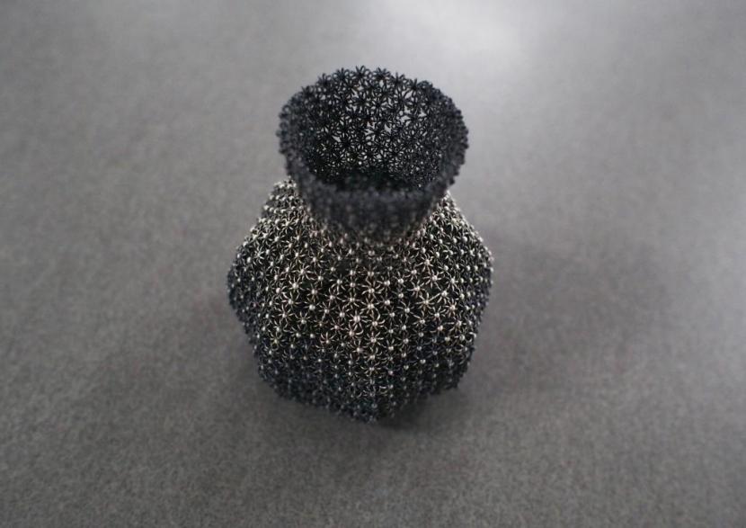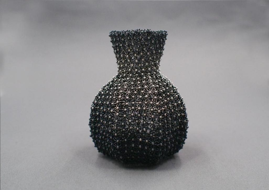 该作品的主题思想以充满仪式感的桌上器形式,使似曾相识的“废弃之物”重新回归到人们的日常生活中。在单元化的重构中达成设计和理念的创新,探讨器物从被欣赏到遗弃,又作为艺术品再次被重新审美的艺术化历程。通过运用“花丝小松”纹饰作为独立的单位,经过大量累积焊接成瓶体,在循环往复的心手相传中作品获得手艺的温度,新的艺术体验和创作灵感孕育其中。看似普通的废弃香水瓶,在“材美与工巧、气韵与事宜”的加持下,重新焕发强大的艺术生命力。作品造型生动、线条洗练,形式既简单又兼具可读性,着重探讨造物视域下新时代艺术人文思想的表达与反思,颇具当代金属艺术风格。