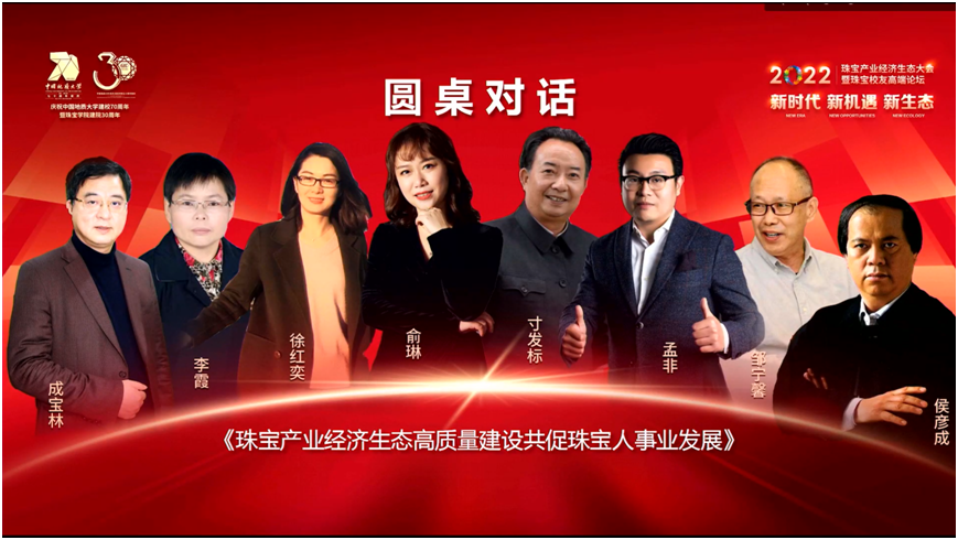 圆桌会议阶段,河南省方城县县长李霞,豫园珠宝时尚集团党委书记俞琳,国家级非遗传承人寸发标,中国玉文化研究会会长侯彦成,武汉新金投资管理有限公司执行董事兼总经理孟非,世界技能大赛珠宝加工项目中国技术专家组组长、北京服装学院教授邹宁馨,深圳金银珠宝创意产业协会秘书长、七星钻石(香港)有限公司董事长成宝林,HRD Antwerp中国区总监徐红奕等围绕珠宝产业经济生态高质量建设共促珠宝人事业发展主题进行对话,各位嘉宾从政、产、学、研以及国际化发展、文化传承、人才培养、产品创新等方面深入探讨,发表真知灼见。