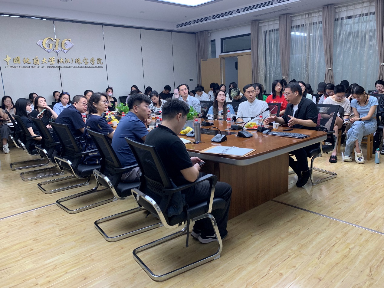 尹作为教授讲话。他指出,珠宝设计者心中要有艺术,要有文化,要有科技,而且要让它们之间相互融合。要多鉴赏优秀作品,提升自己的艺术修养;多读优秀书籍,增加自己的知识阅历;多做科技实验,从总结经验提升技术能力。