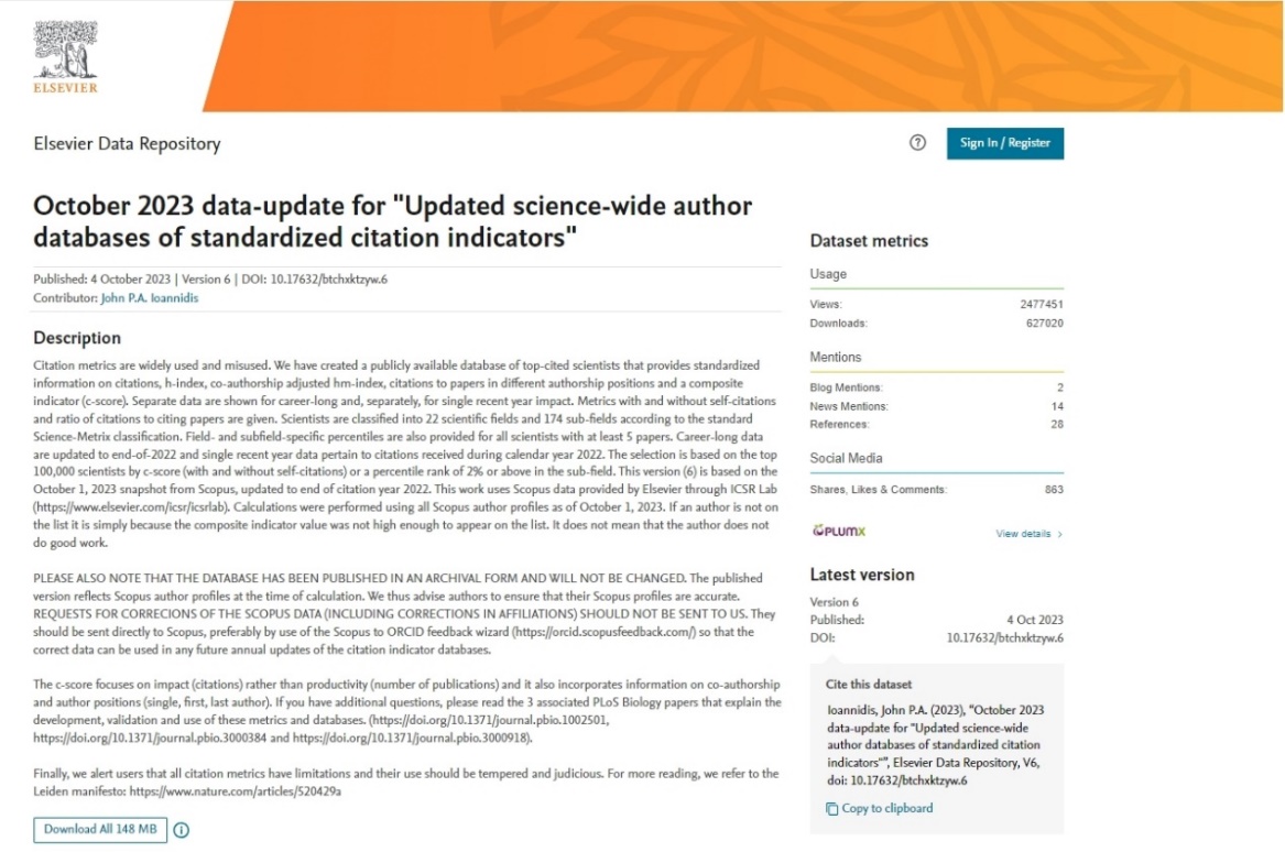近日,美国斯坦福大学和爱思唯尔数据库发布了第六版《全球前2%顶尖科学家榜单2023》,该榜单基于Scopus数据库,使用总引用量、h因子、hm因子、单独作者、单独或者第一作者、单独、第一或者最后作者文章引用量六种关键因素的指标进行打分,从近700万科技工作者中,筛选出世界排名顶尖2%的科学家,涵盖文、理、工学科,涉及22个领域和174个子学科,旨在提供一个科学家长期科研表现的衡量指标,更客观、更真实地反映科学家的影响力。