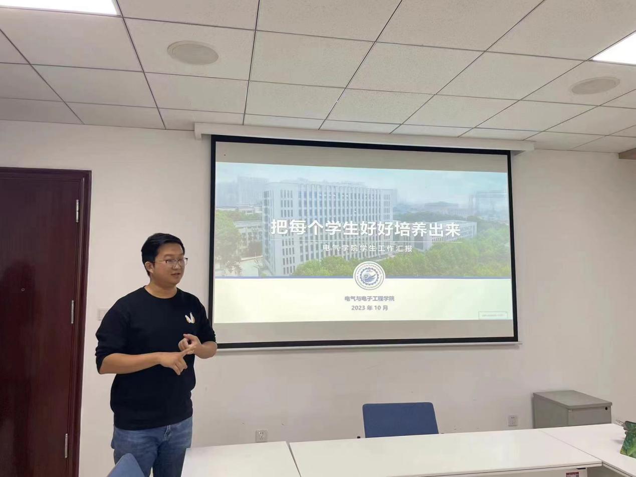 电子与电气工程学院研究生辅导员董蛟龙老师介绍了学院基本情况与学生工作特色案例,阐述了“把每个学生好好培养出来”的教育理念,表达了希望与地大师生进行更多交流与学习的期待。电气与电子工程学院研究生辅导员晋凡舒老师对媒体宣传工作、文体活动工作、一站式社区建设进行了详细的介绍。