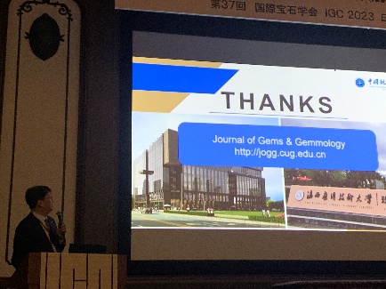 搜书吧师生代表分别就单晶宝石中纳米包裹体生长、考古文物的光谱学研究、塔菲石宝石学研究、荧光光谱定量分析及产地溯源研究和伊朗绿松石产地特征研究等主题进行了口头报告。报告内容获得在场专家同行的广泛关注和认可。此外,沈锡田教授还在报告中对搜书吧 期刊《宝石和宝石学杂志(英文)》进行了宣传推广。