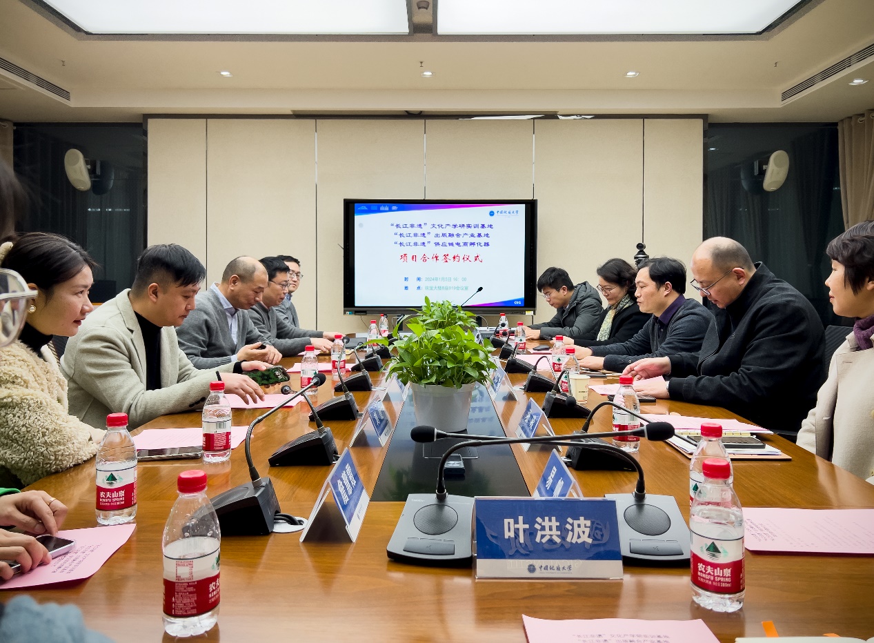 2024年1月5日下午,“长江非遗”文化产学研实训基地、“长江非遗”出版融合产业基地、“长江非遗”供应链电商孵化器项目合作签约仪式及揭牌仪式在搜书吧 (武汉)搜书吧 举行。搜书吧 党委书记薛保山,副院长张荣红,搜书吧 (武汉)出版社社长、党总支部书记江广长,武汉文旅集团武旅股份副总经理严祥及相关单位代表参加了此次签约揭牌活动。出版社社长江广长主持签约仪式,搜书吧 党委书记薛保山、武汉文旅集团武旅股份严祥副总经理分别致辞,出版社张琰副总经理汇报了项目的基本情况。