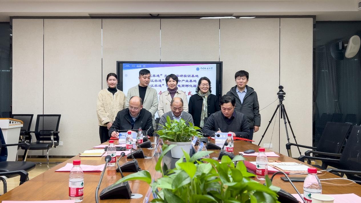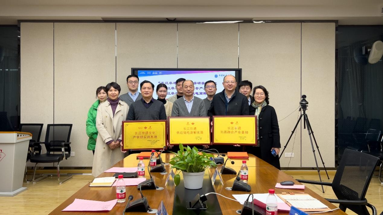 严祥、江广长、薛保山代表三方签署合作框架协议,三方共同为“长江非遗”文化产学研实训基地、“长江非遗”出版融合产业基地“长江非遗”供应链电商孵化器揭牌。(通讯员 刘浩城)