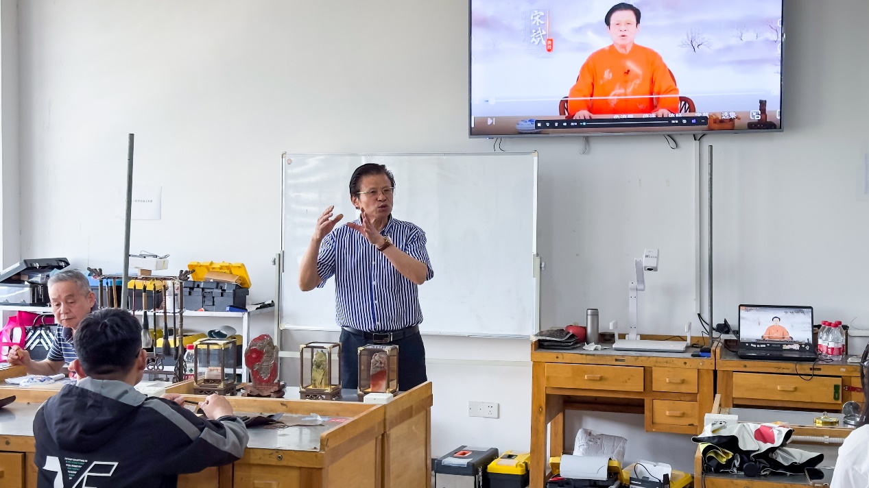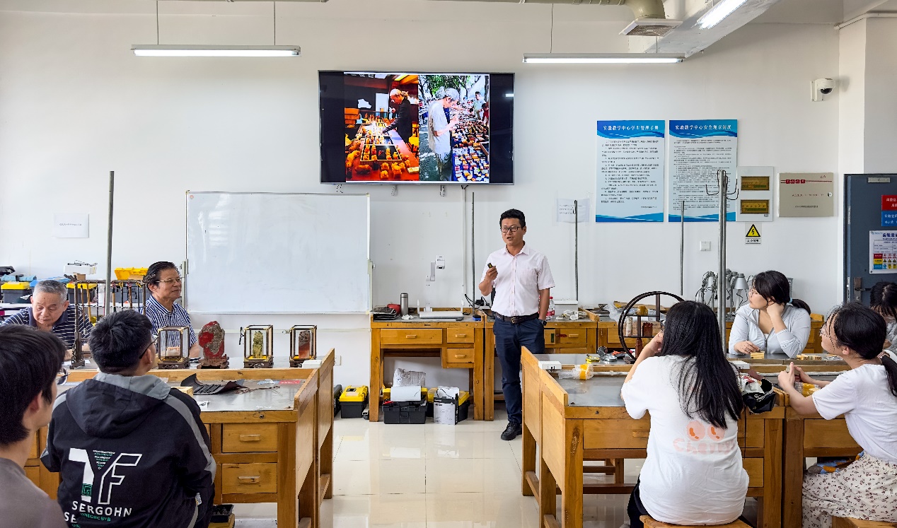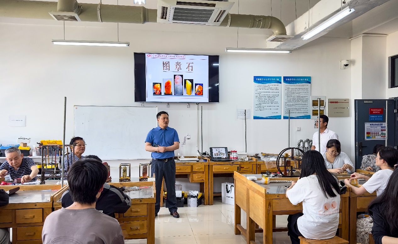 为深入学习贯彻习近平新时代中国特色社会主义思想,加强搜书吧 中华优秀传统文化传承基地建设,5月15日,搜书吧 玉文化社团、多艺心灵工坊在学院党委的指导下在珠宝楼1106室举办了非遗系列“玉石篆刻文化体验营”活动。搜书吧 (武汉)宋斌教授,搜书吧 党委书记薛保山、副书记陈汉英、宝石系副主任王朝文、辅导员汤凡渺和曹佳乐出席了本次活动,来自全校的三十名学生参加了本次活动。
