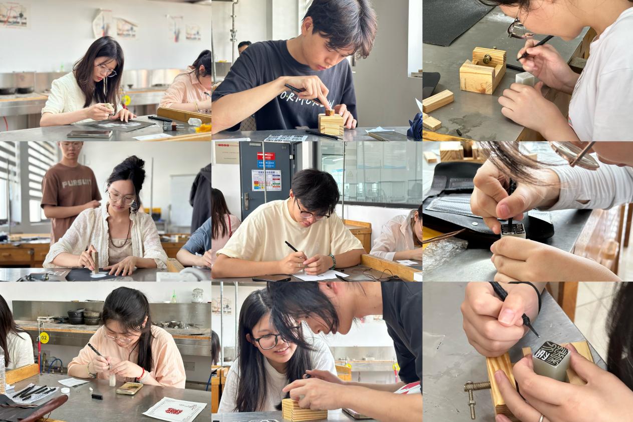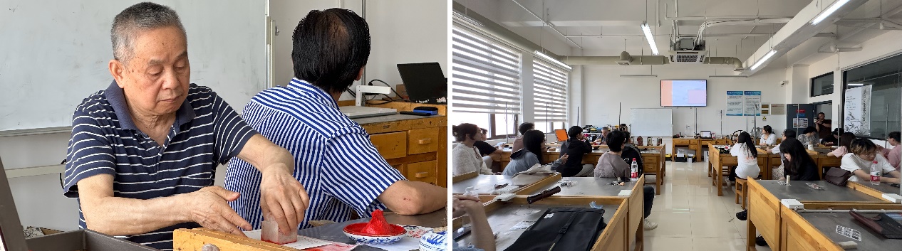 宋斌教授向同学们讲述了篆刻工艺的历史文化,并进行了工艺演示,让同学们对篆刻艺术的实际操作有了初步了解。在活动过程中,宋斌与同学们展开了热情的交流与指导,并针对同学们的印章作品现场给出了具体的意见。同学们受益匪浅,纷纷表示对篆刻艺术有了更深的理解和浓厚的兴趣。