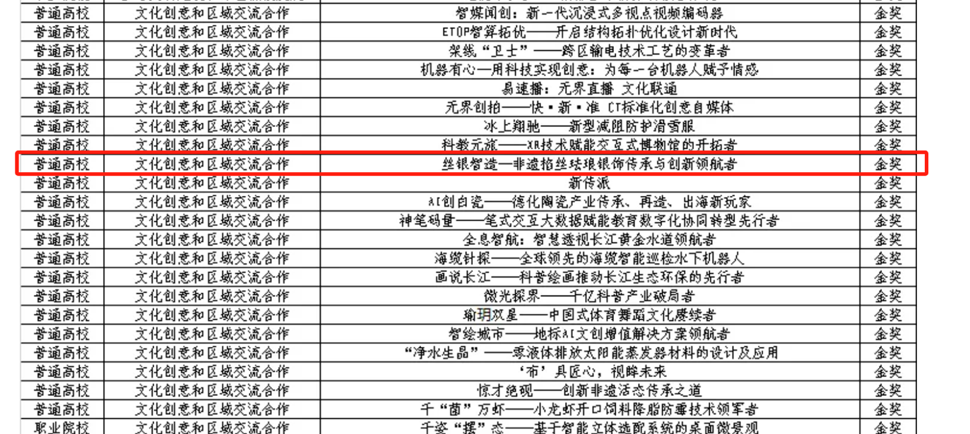 由胡中银、刘静文、浦格菲、韦意、李昊、卢婉琳、敬佳欣、石婷婷等8位同学共同完成的《丝银智造——非遗掐丝珐琅银丝传承与创新领航者》项目荣获湖北省金奖。项目综合运用先进的3D打印贵金属技术、AI辅助设计,以及国标级增材用银粉末,致力于将传统的非物质文化遗产——掐丝珐琅银饰与现代时尚元素相结合。通过技术创新实现掐丝珐琅银饰的快速、高效及规模化生产,旨在国内外市场推广和发展这一独特的传统工艺,让更多人了解和欣赏掐丝珐琅银饰的魅力,促进中华优秀传统文化的传承与发展。该项目由冯文婷、李正、尹作为、张荣红和陈汉英等教师共同指导。