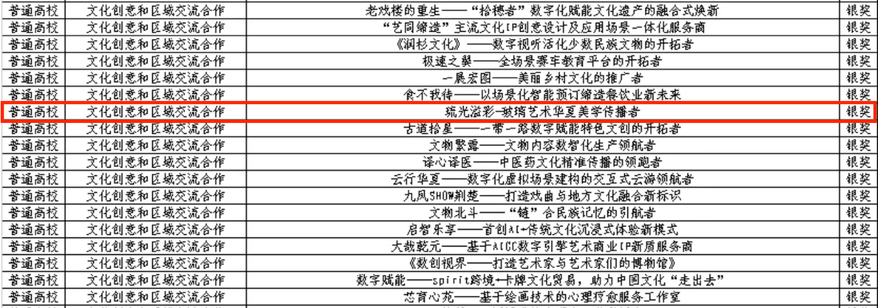 由陈淑玲、谢媛、Bahareh Shirdam、黄丽君、杨熙、马恺璐、孙长恒等7位本硕博学生完成的《琉光溢彩——玻璃艺术华夏美学传播者》项目荣获湖北省银奖。项目基于珠宝首饰设计和玻璃工艺理论和技术学习成果,巧妙地运用传统美学元素和玻璃工艺进行创新设计研发,不仅创作了上百件富有创意和美感的作品,还通过非遗工艺体验和首饰产品设计的方式,积极宣传和推广非遗技艺,收获了一批年轻人对传统文化的热爱与传承。团队成员学生工作经验丰富且参加国家级展览比赛10余项,省级比赛60余项,获“全国技能能手”等技能证书20余项,并以第一作者身份发表了5篇学术论文,申请1项专利。希望通过不断的创新和努力,能够运用玻璃艺术疗愈为更多人提供帮助。该项目由陈汉英、汤凡渺、张荣红等教师共同指导。