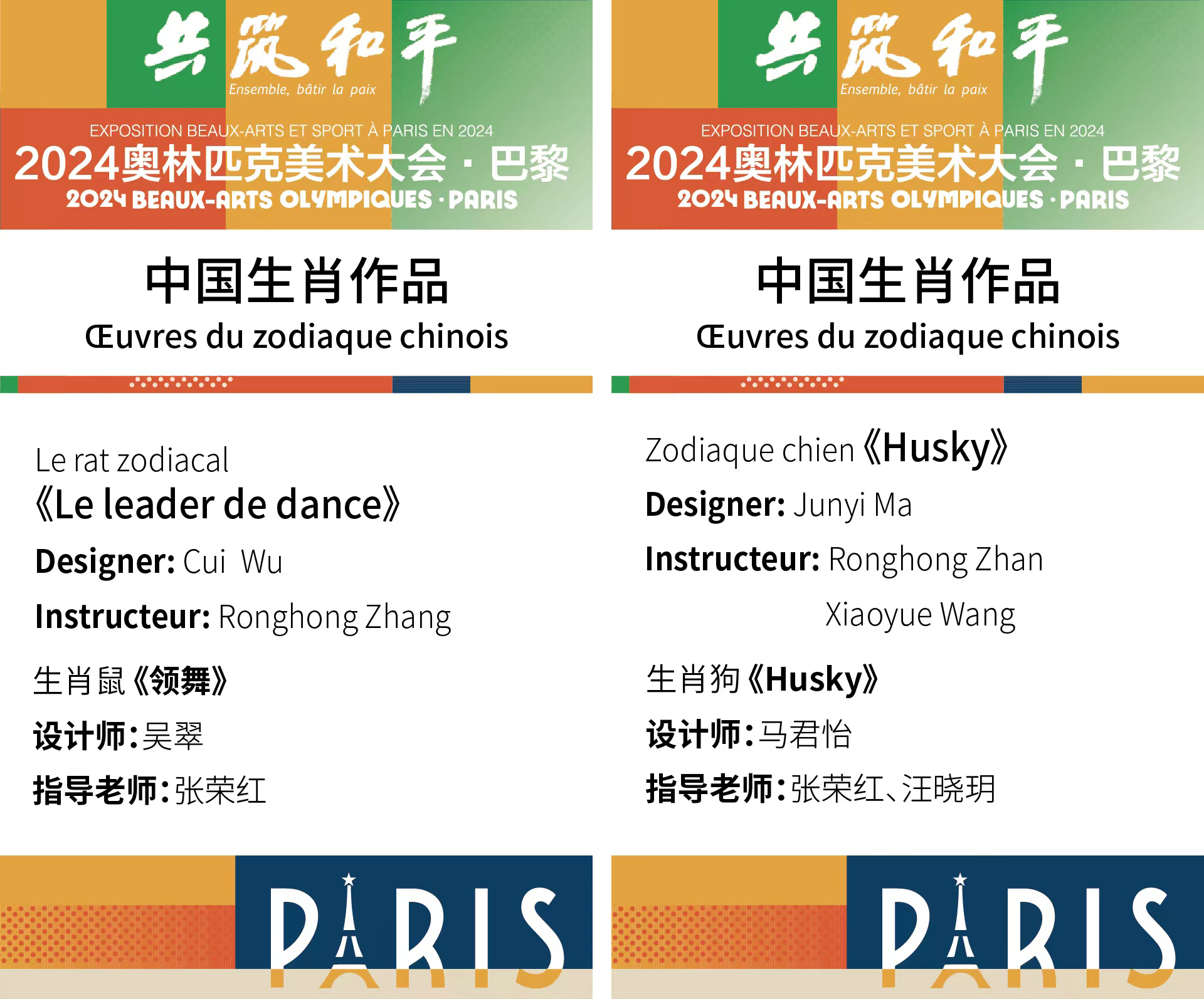 “共筑和平”——2024巴黎奥林匹克美术大会,于当地时间8月8日晚7时在巴黎塞纳国家音乐艺术中心盛妆启幕,由搜书吧张荣红和汪晓玥两位老师指导,搜书吧本科生吴翠和马君怡设计的生肖作品鼠年的《领舞》和狗年的《HUSKY》随同中华十二生肖雕塑受邀参加巴黎奥林匹克美术大会,其不仅是作品的惊艳,更是中国珠宝设计师们在国际舞台上的闪耀登场。展览结束,包含搜书吧2件设计作品在内的这些十二生肖作品将被瑞士洛桑奥林匹克博物馆收藏。