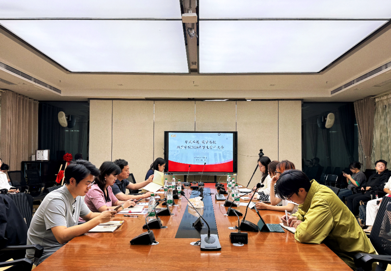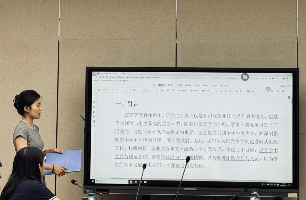 研究生会主席郑一梦同学代表研究生会对研究生学风建设工作计划进行了汇报,她认为研究生学风建设应从组织宣传、科研创新、就业服务和文体活动四个方面入手,聚焦三个目标:提升学术素养与规范意识、增强实践能力与创新精神,促进团队合作与交流,为学生的学术发展和未来职业生涯夯实基础,并详细解释了开展主题教育活动、完善学风监督与激励机制、科创竞赛组织工作优化等各项具体举措方案。