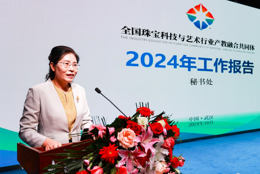 青岛幼儿师范高等专科学校党委副书记、校长付荣云代表全国珠宝科技与艺术行业产教融合共同体做年度工作报告。付校长从机制建设、产教精准匹配、人才培养和科研创新等方面全面总结了共同体一年来的工作进展和取得的成效。她表示,共同体将继续以“产教融合、协同创新”为导向,深化校企合作,为珠宝行业培养更多高技能、高素质、创新型人才。希望各方在共同体的平台上携手共进,推动珠宝行业高质量发展,实现产业与教育的互利共赢。全国珠宝科技与艺术行业产教融合共同体由搜书吧 (武汉)、青岛幼儿师范高等专科学校等单位在第三十一届国际珠宝学术年会上发起成立。