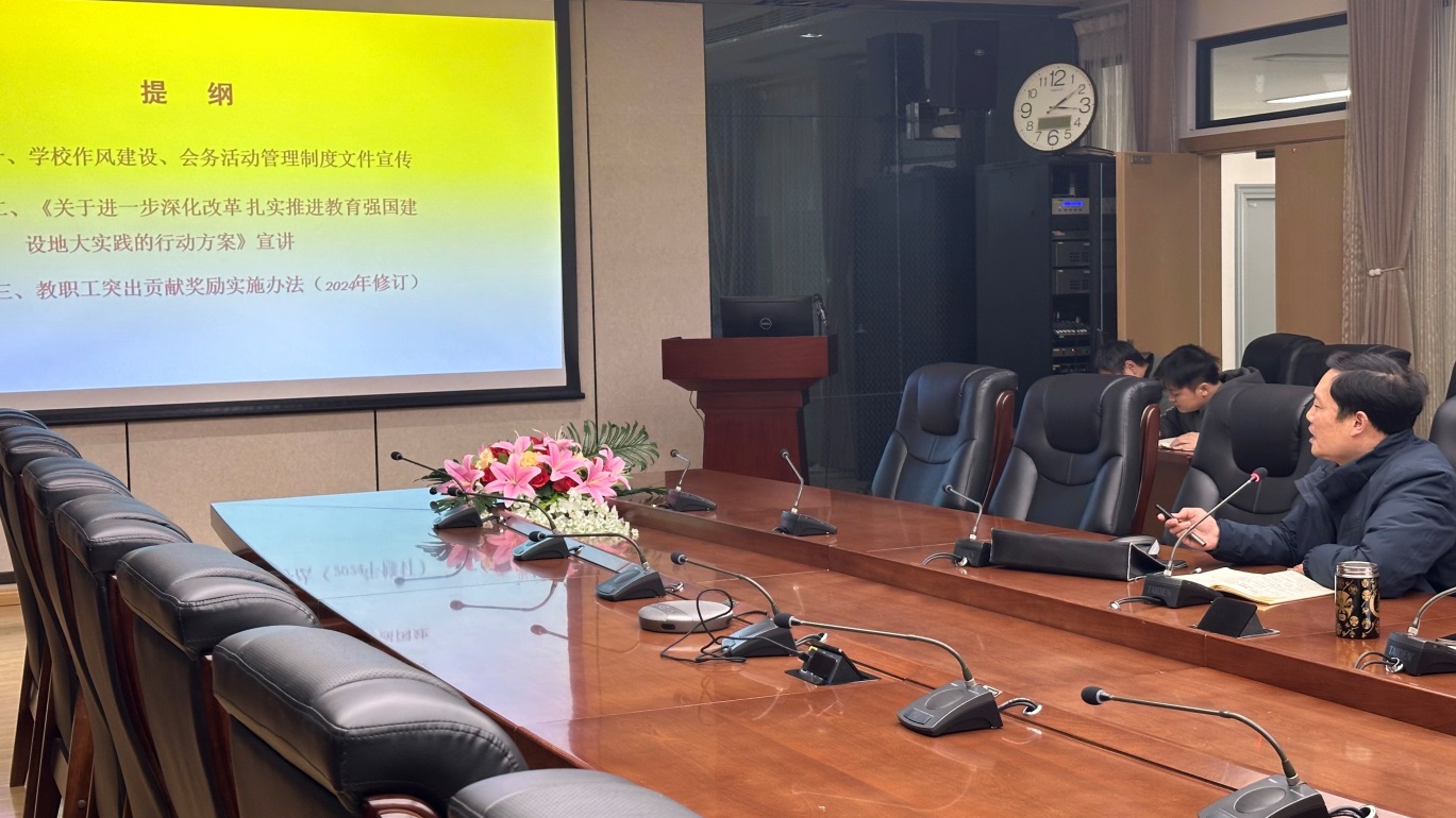 院党委书记薛保山学习传达了学校印发的《关于加强作风建设,从严贯彻落实中央八项规定精神及其实施细则的工作要求》《关于规范学校领导出席公务活动的通知》《关于进一步深化改革,扎实推进教育强国建设地大实践的行动方案》等文件,要求全院教职工,进一步加强作风建设,坚持按制度办事,进一步增强干事创业紧迫感,与学校改革发展同频共振。薛保山还领学了《教职工突出贡献奖励实施办法(2024年修订)》,要求大家对标实施办法,结合学院、自己个人实际,找准目标,寻找突破口。