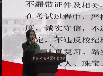 随后,大一的方婉晶同学上台宣读了《诚信考试承诺书》,使同学们对诚信考试的具体要求有了更进一步的了解。主持人为同学们展示了《学生手册》中有关作弊行为处理的条例,申明了作弊行为的边界,再次严肃了考试纪律。