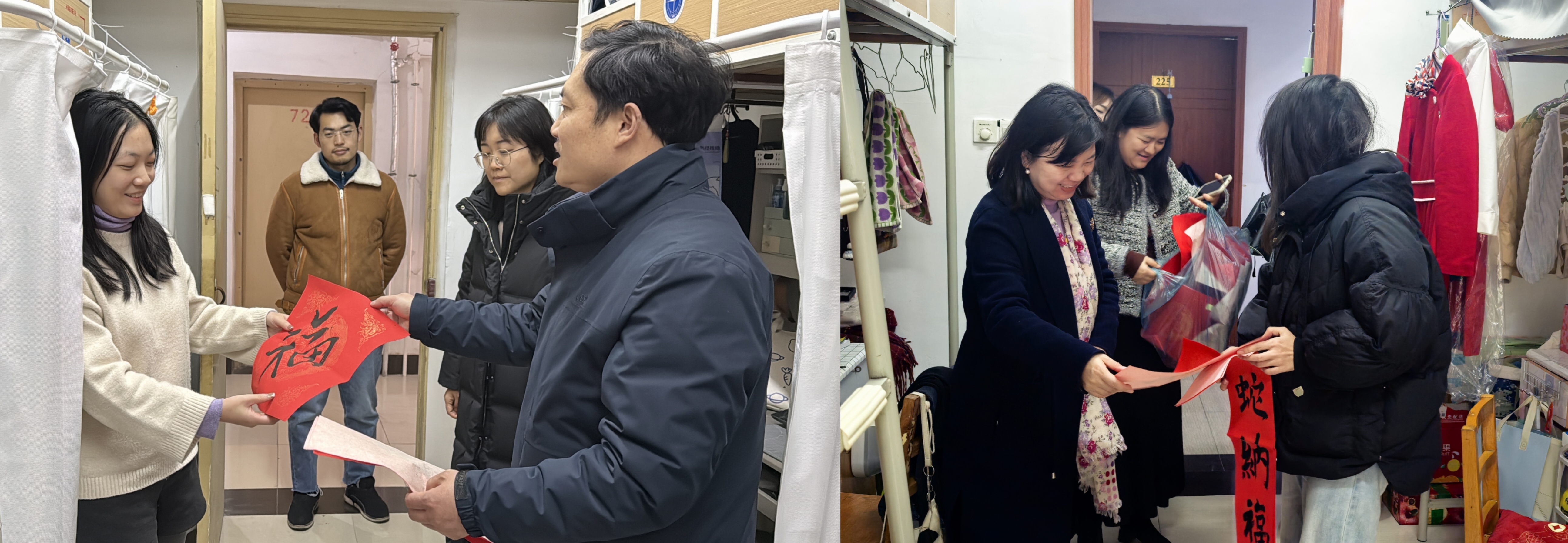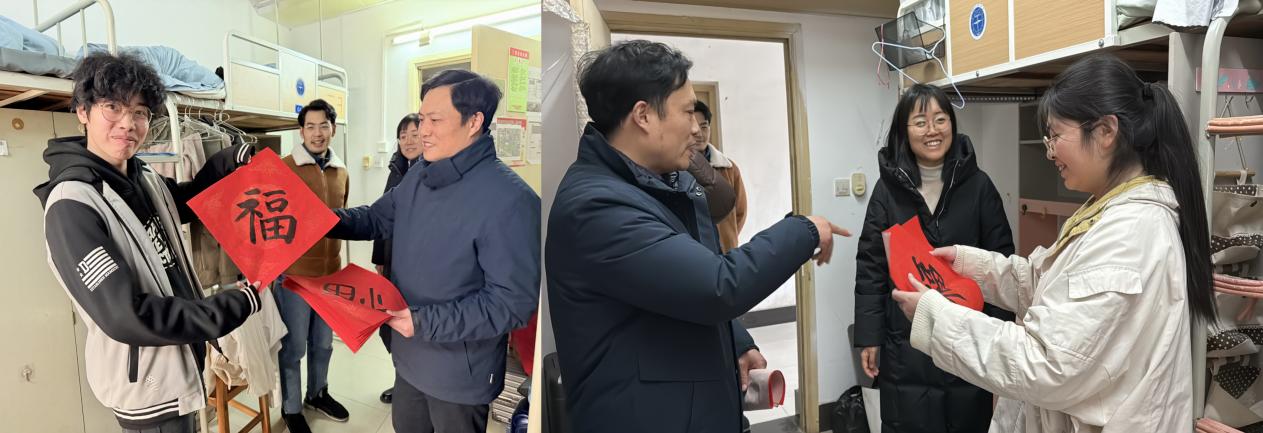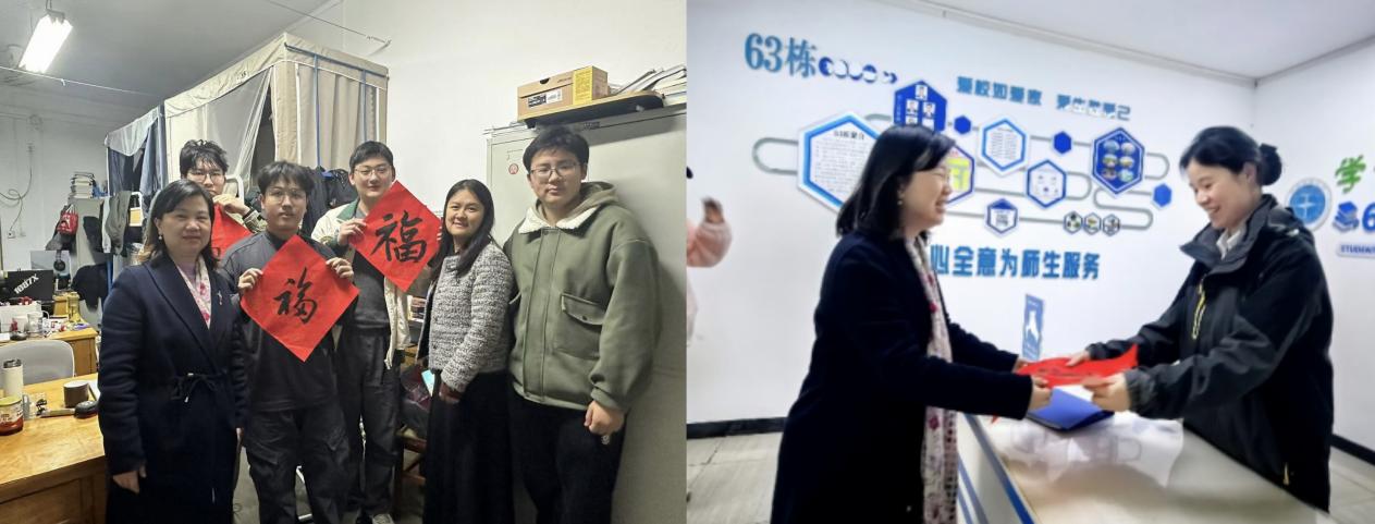在走访最后,老师们还特别为每个宿舍送上了手写的“福”字,寄托着学院对同学们的美好祝福。每一张“福”字都代表着学院对同学们的关爱与期许,希望大家在新的一年里,学业进步、科研顺利、生活愉快。这份温暖的心意让同学们感受到浓浓的关怀,激励大家在未来的道路上勇敢前行、再创佳绩。 同时老师们也为63栋女寝宿管送去了祝福,冬至幸福至,老师们希望把这份幸福分享给每一个人,同时希望在这个寒冷的冬天里老师与同学们可以互相关怀,共同迎接美好幸福的明天!