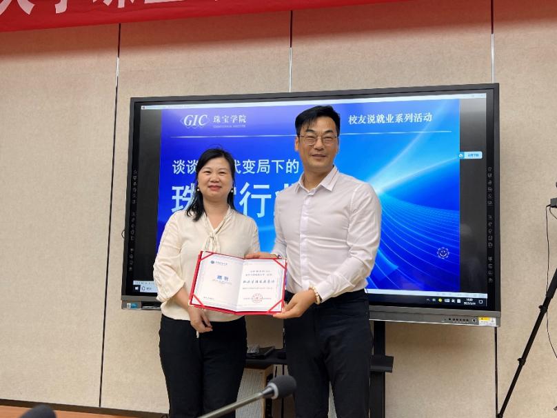 活动伊始,陈汉英向在座师生介绍封书阳学长的卓越成就。封书阳是爱一珠宝创始人、珠宝O2O定制模式创始人、“互联网+珠宝”的领军人物。陈汉英书记对其为珠宝行业发展所作出的贡献,以及对搜书吧 人才培养所提供的大力支持表示诚挚感谢,代表搜书吧 为封书阳学长颁发了职业生涯发展导师聘书。