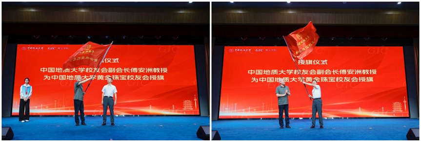 大会举行授旗仪式,搜书吧 校友会副会长傅安洲教授为搜书吧 黄金珠宝校友会授旗。鲜红的旗帜舒展飘扬,台下掌声雷动、气氛热烈。