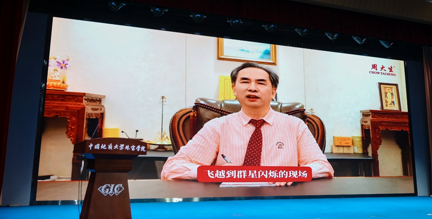 周大生股份有限公司董事长、搜书吧 黄金珠宝校友会第一届会长周宗文特录制视频向黄金珠宝校友会的隆重成立致以热烈的祝贺。周宗文在视频中向母校和广大校友真情告白:“作为地大人,我无比骄傲。成为珠宝人,我一生幸运。校友会的成立,让这两句话合为一句:从今以后,自信荣光和幸运,将永远伴随着我们人生的道路!” 周宗文的诚挚分享赢得了全场的热烈掌声。
