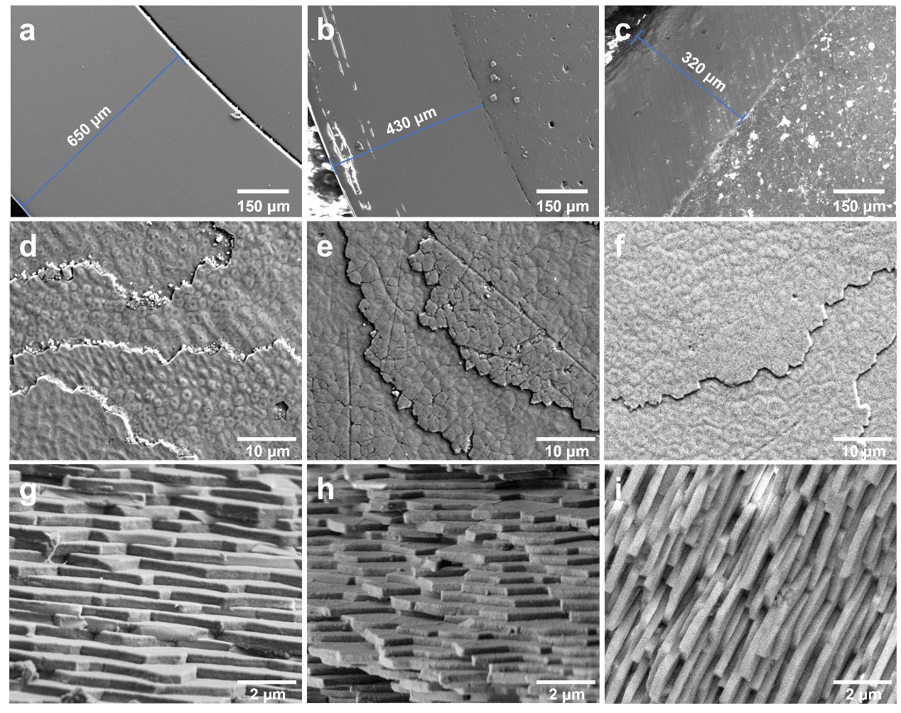 图5 空心陶瓷核珍珠和Akoya珍珠的SEM图像:(a-c)层核交界处;(d-e)珠层表面结构;(g-i)珠层横断面结构