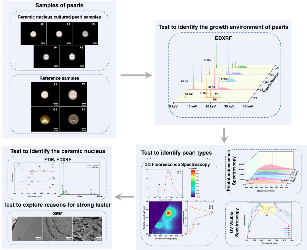 在珍珠价值评估中,光泽占据着极为重要的地位。新型珍珠的强光泽特质,使其有望成为高品质珍珠的新成员。然而,仅从外观难以将其与普通珍珠区分,且强光泽成因不明。为攻克难题,研究团队运用X射线荧光光谱(EDXRF)、三维荧光光谱、紫外可见反射光谱及扫描电子显微镜(SEM)等技术,对新型与普通养殖珍珠进行系统表征(图2,3)。经检测,确定该批珍珠是以空心陶瓷珠为核的海水养殖珍珠,推测采用空心陶瓷珠是为调节密度接近传统贝壳核心密度。