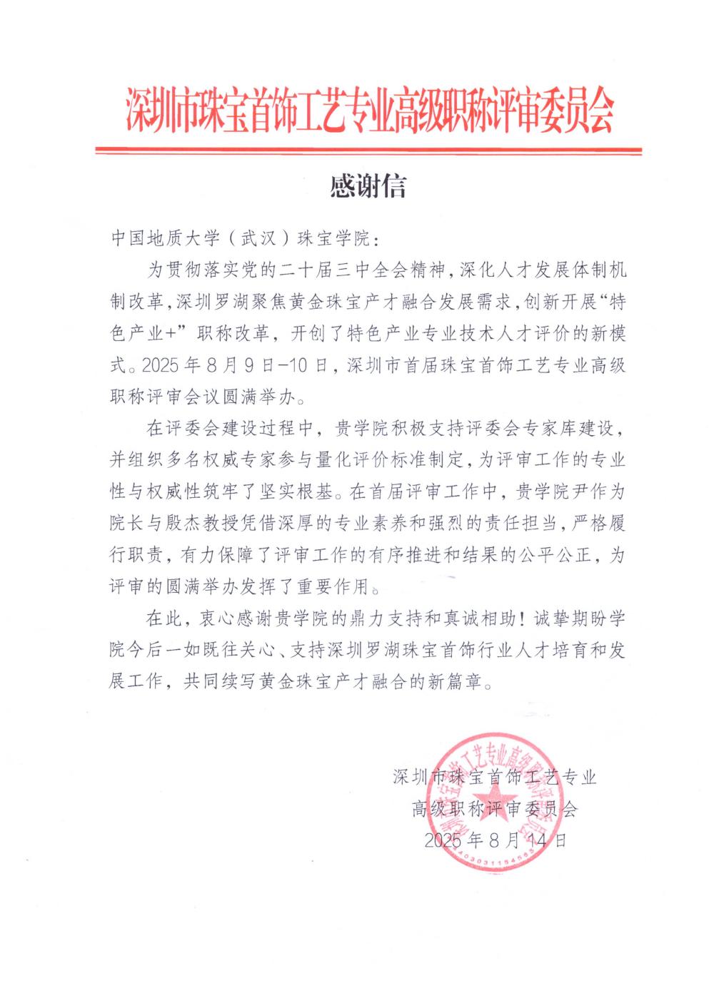 学院在此次评审工作作出突出贡献,收到了深圳市珠宝首饰工艺专业高级职称评审委员会的感谢信。信中写到:“在首届评审工作中,贵学院尹作为院长与殷杰教授凭借深厚的专业素养和强烈的责任担当,严格履行职责,有力保障了评审工作的有序推进和结果的公平公正,为评审的圆满举办发挥了重要作用。”