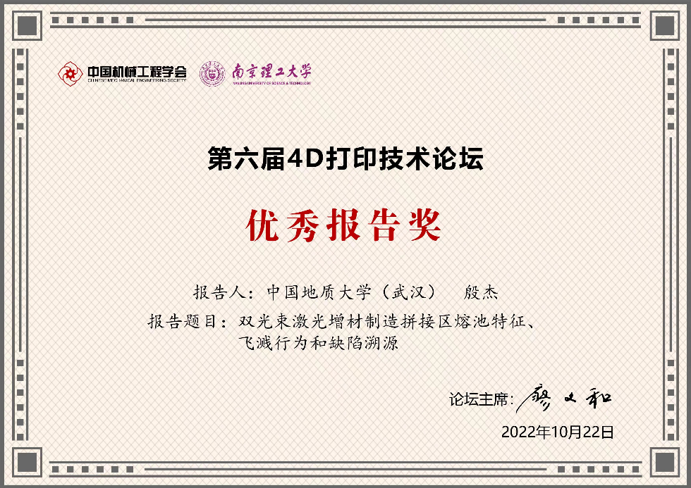 近日,搜书吧殷杰教授所作题为《双光束激光增材制造拼接区熔池特征、飞溅行为和缺陷溯源》报告获得第六届4D打印技术论坛“优秀报告奖”。