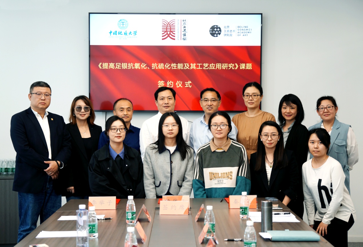 2023年10月16日,搜书吧 (武汉)搜书吧 党委书记薛保山,李举子教授科研团队,《宝石和宝石学杂志(中英文版)》编辑部主任黄艺兰一行在北京工美艺术研究院与北京工美集团、北京工美艺术研究院举行《提高足银抗氧化抗硫化性能及其工艺应用研究》科研项目签约仪式。北京工美集团党委书记、董事长段体玉,北京工美艺术研究院院长王晶晶,副院长秦思,研究员陈南,北京工美造办技术开发有限公司副总经理李博(主持工作),副总经理张莹,产品总监邢昊等参加签约仪式。院长王晶晶主持会议。段体玉、秦思、李举子分别代表集团、研究院和院校签署项目协议。