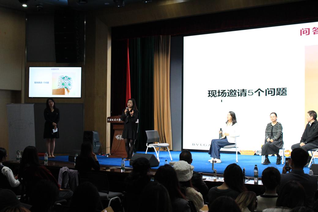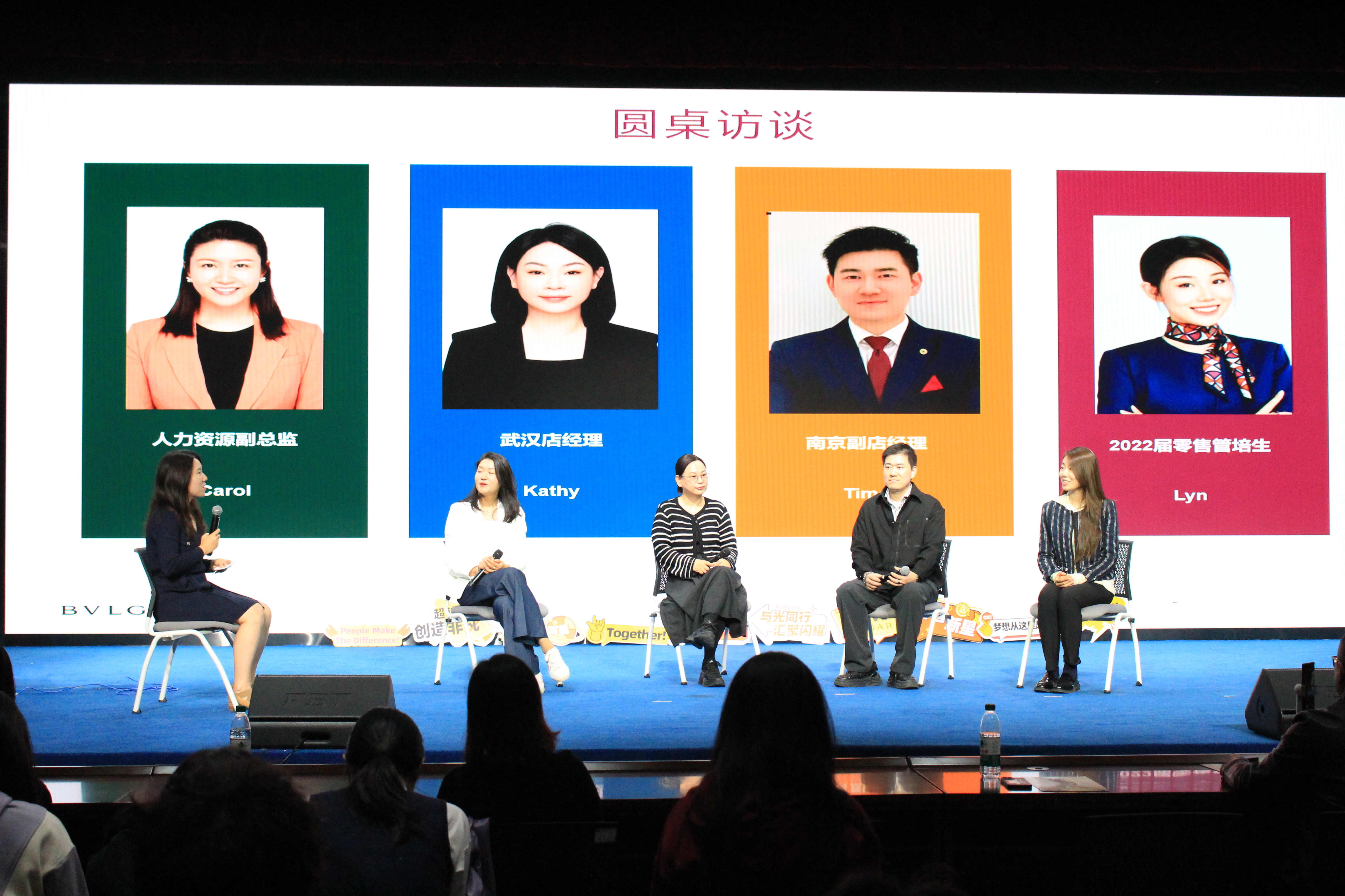 公司5位嘉宾于场上就坐,开展了一场别开生面的圆桌访谈。武汉恒隆及SKP店经理Kathy ZHANG分享了她在门店与同事们的相处经验,优秀员工代表—南京IFS店铺副经理及Top sales员工Timo WANG分享了自己跨专业转行做销售的心路历程。2022年零售管理培训生Lyn JIN作为搜书吧 毕业生学姐分享了从一个珠宝设计的学生到宝格丽培训生的切身体验,生动展示了奢侈品行业的独特魅力与发展机遇,拉近了公司与毕业生之间的距离。